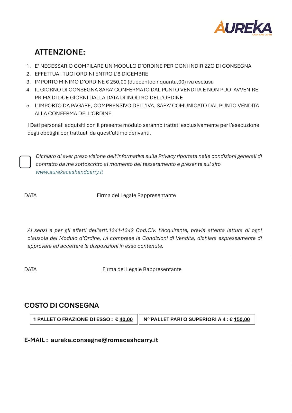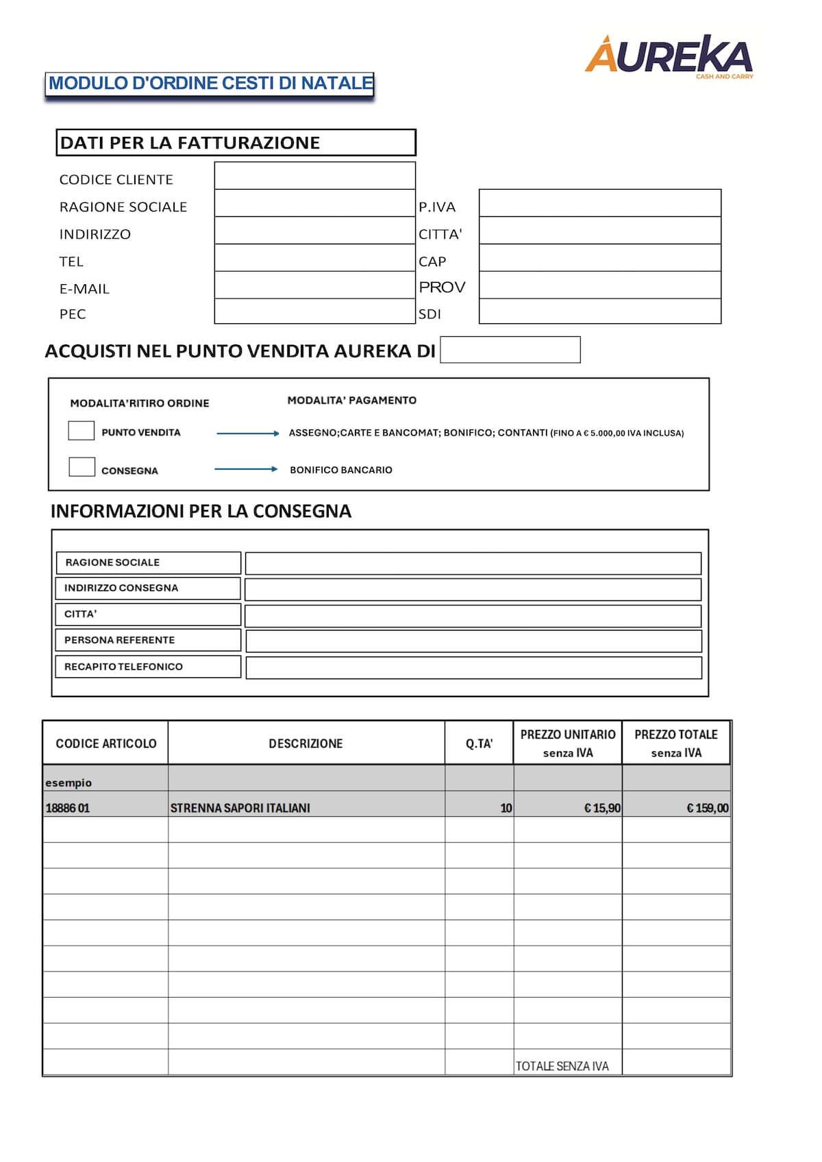 Ordina i Cesti o le Cassette da catalogo direttamente in Punto Vendita (con un minimo d’ordine di €250,00 IVA esclusa) e paga comodamente con carta di credito, assegno, bancomat o contanti fino a € 5000,00. Puoi concordare la consegna direttamente presso la tua attività o il ritiro in Punto Vendita